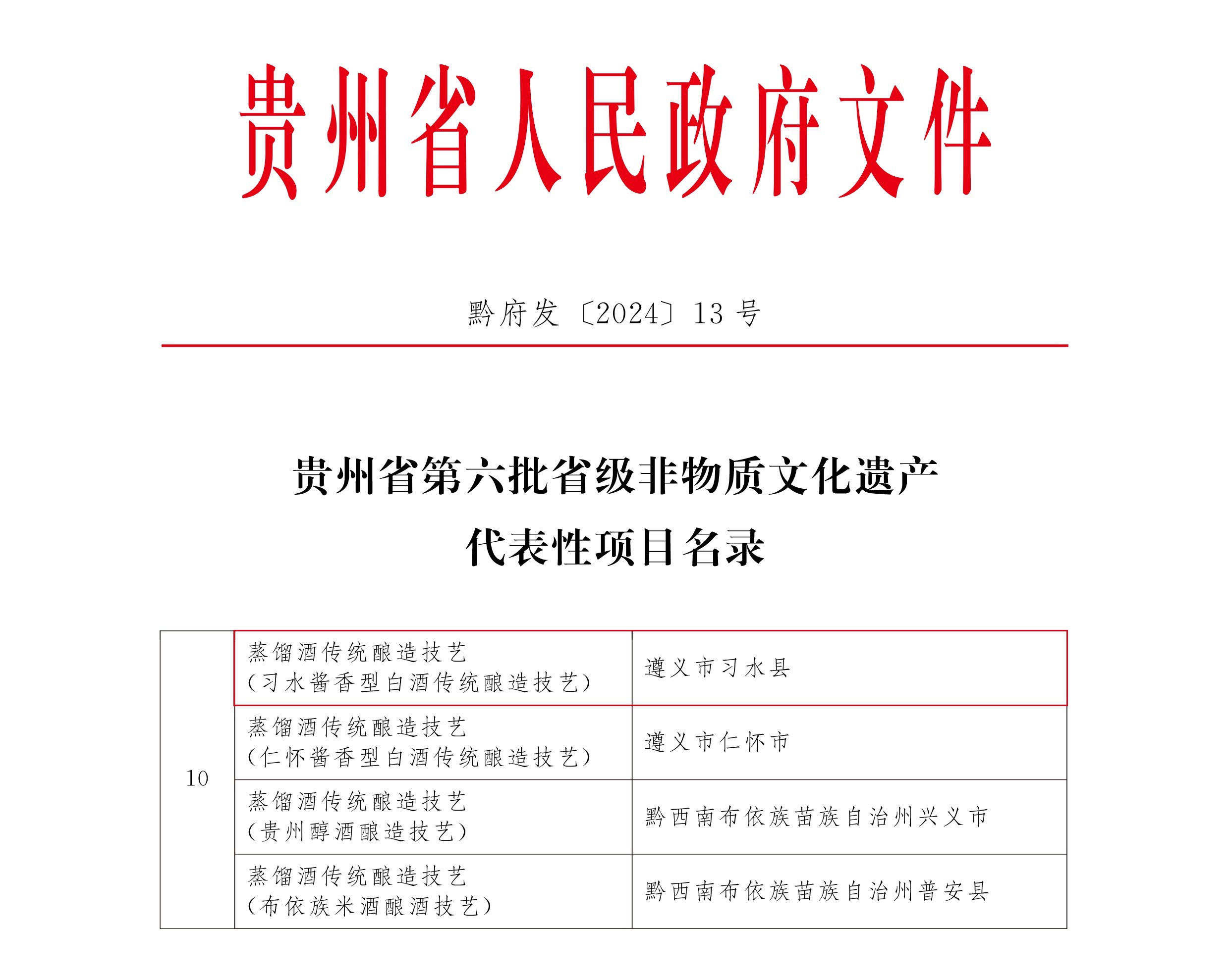 来源: 安酒集团 发布日期: 2025-01-08近日,贵州省政府公布第六批省级非物质文化遗产项目名录,由安酒等企业申请提报的习水酱香型白酒传统酿造技艺,荣耀入选。这不仅是对习水悠久酿酒历史和深厚文化的高度认可,也是对包括安酒在内的当地酿酒匠人在酱酒传统技艺方面传承和坚守的极大肯定。
