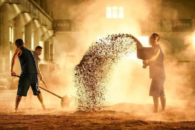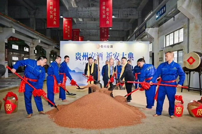 在贵州安酒第9酿酒车间,张福钧、徐振兴、黄进带领员工翻沙润梁完成启动仪式,车间主任带领酿酒工匠进行了质量宣誓。